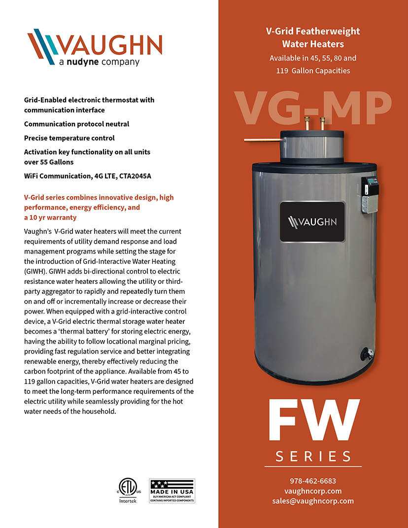 The Vaughn VG-MP Grid-Enabled Featherweight Electric Water Heater brings utility-ready functionality in a lightweight, easy-to-install package. When paired with a grid-interactive control, a V-Grid electric thermal storage (ETS) water heater acts as a thermal battery. It can respond to price signals (LMP), work better with renewable energy sources, and help stabilize the grid. Its seamless thermoplastic tank resists corrosion and elevated temperatures without needing a sacrificial anode. The grid-enabled thermostat supports CTA-2045, Open ADR, WiFi, cellular, and BACnet for flexible integration with demand response programs.