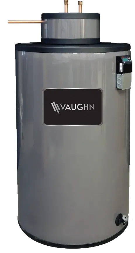The Vaughn Featherweight Thermoplastic Electric Water Heater offers big performance in a lighter package. Thermoplastic tank construction reduces handling weight without compromising compatibility, temperature control, or performance. There’s no dissimilar metals and no anode rod to maintain. All models feature top-mounted plumbing connections, field removable heat exchanger, and a single-bolt stainless steel collar for quick service access. Digital temperature controls with thermistors give end-users the accuracy they expect. Mixing valve option boosts the capacity 45 or 55 gallon units by storing the water at an elevated temperature.