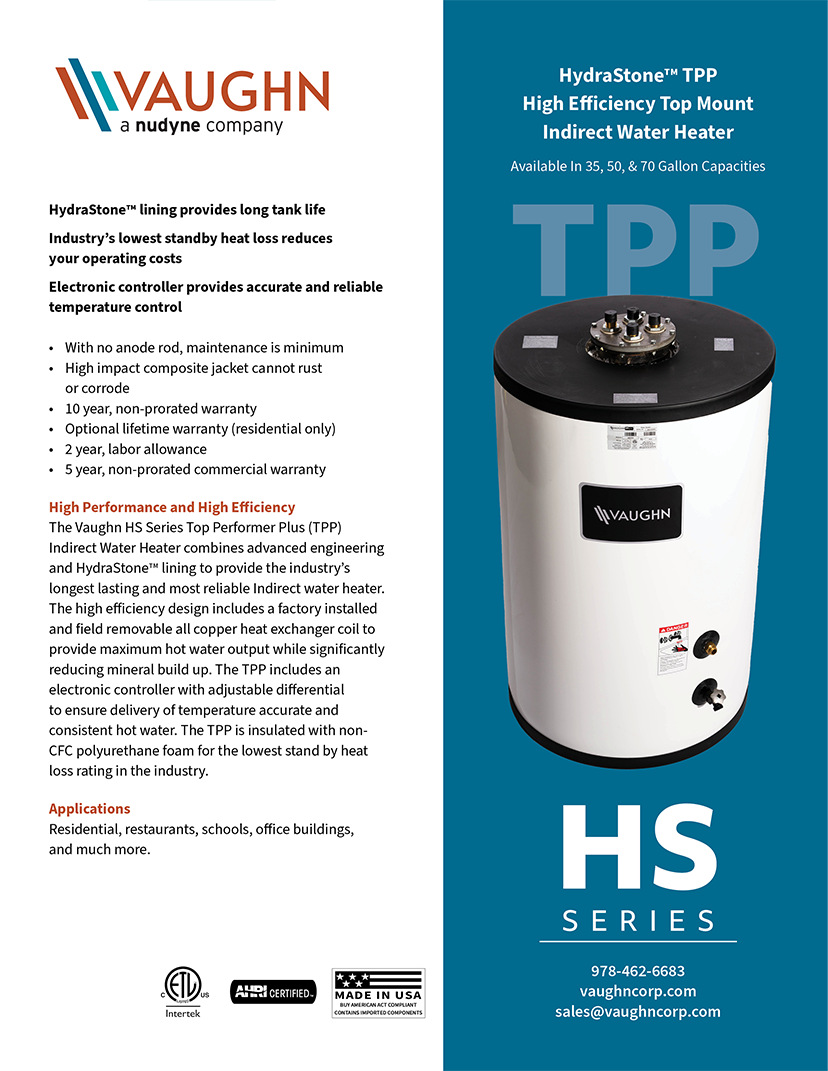 Built to last—and to save you time. The Vaughn Top Performer Plus (TPP) Indirect Water Heater features a field removable copper heat exchanger and top-mounted fittings to make connections straightforward. A cold-water diffuser keeps the heat exchanger clean, cutting scale buildup by 50% and boosting output by over 20%. Plus, ½" HydraStone™ cement lining defends against corrosion from the inside out. With 2" thick CFC polyurethane foam insulation, standby heat loss stays at a minimum. An electronic controller maintains tight temperature accuracy within 2°F and displays real-time system status through a multicolor LED. The TPP arrives ready for install, no on-site assembly required.